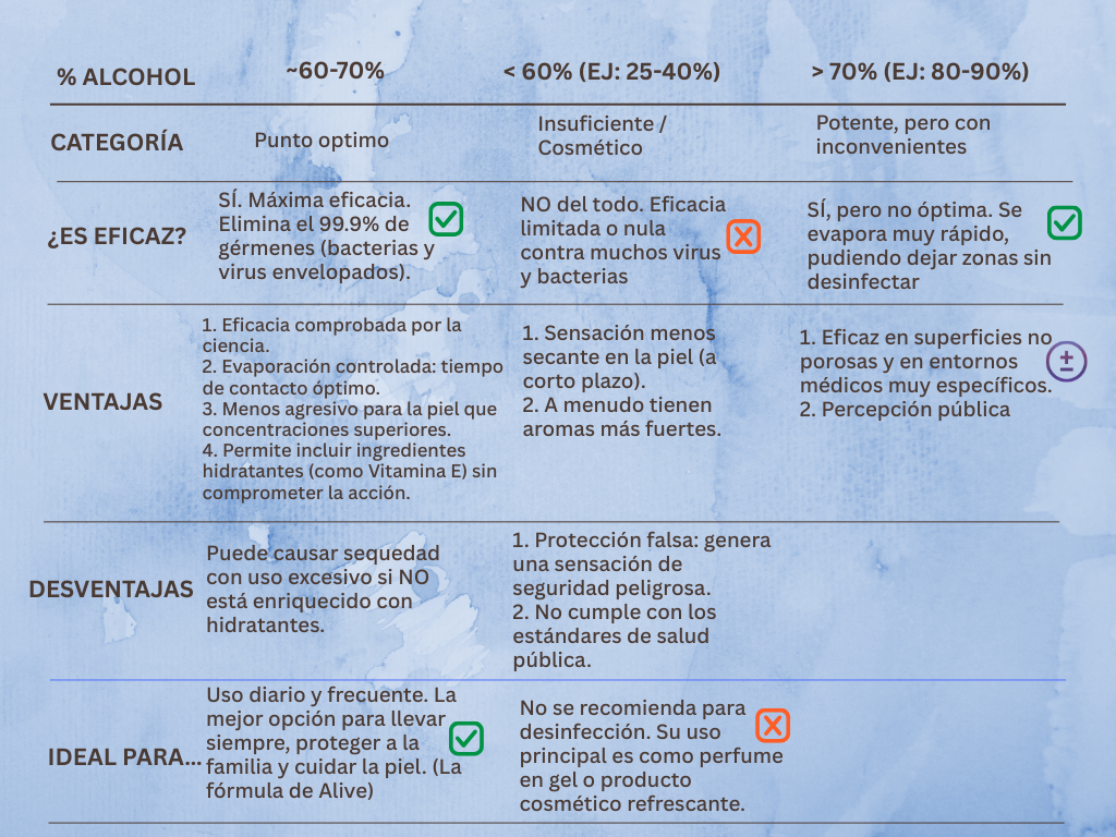 Alive elige conscientemente el punto óptimo del 60% de alcohol. No es un ahorro de costes; es una decisión basada en la ciencia para ofrecerte la máxima protección posible junto con el máximo cuidado. Mientras otros geles con mayor porcentaje resecan o fórmulas débiles te dejan desprotegido, Alive encuentra el equilibrio perfecto: eficacia que respeta tu piel, gracias a que su fórmula estabilizada permite incorporar agentes hidratantes y Vitamina E que otros geles no pueden mantener. Es la elección inteligente para una protección frecuente, segura y sostenible.